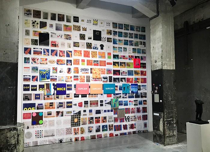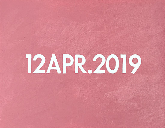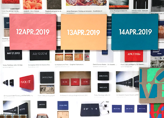 Ode to On Kawara, who made almost 3,000 Date Paintings, following strict rules, like it had to be painted on the day itself. When he didn't finish it in time, he destroyed it. He used font Futura Bold and painted in the language of the country. So these paintings are in Dutch. But I didn't follow all his rules; I painted into the future and imaged the dates of the show. I also used my own favorite colors.