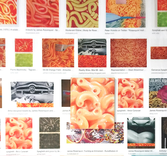 It was a surprise to discover my own paintings popping up in the search results when I googled the title and artist of the original piece, like Spaghetti by James Rosenquist. In this spaghetti search results also Elaine Sturtevant showed (top, middle), she is the mother of all 'copies', she called it repetitions, and she is one of my biggest heroes. She replicated Jasper Johns, Liechtenstein, Stella, Duchamp and others. Warhol gave Sturtevant one of his silkscreens so she could produce her own versions of his Flowers paintings, and when asked about his technique, he said, "I don't know. Ask Elaine."