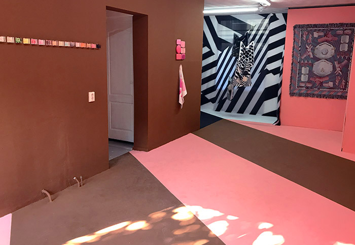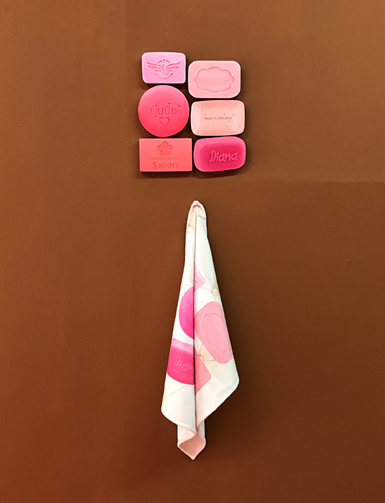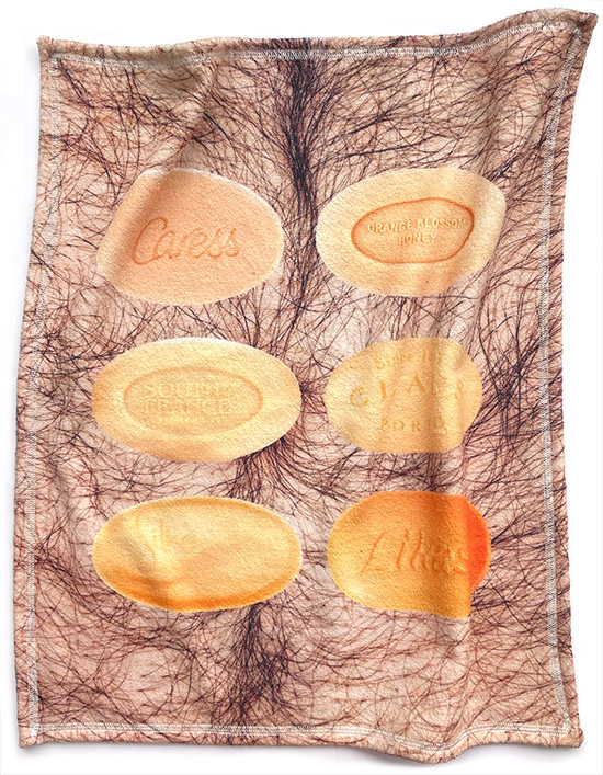 Installation view: war rug, Corona Soap towels, dazzle print