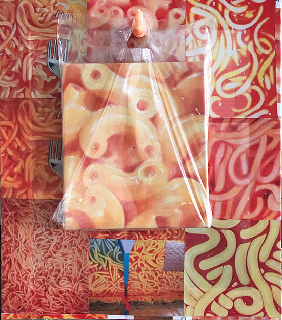assemblage, printed fabric (spaghetti by James Rosenquist and Elaine Sturtevant), oil on canvas, plastic bag, fake finger, 24 x 27 inches (60 x 70 cm), 2017-2020