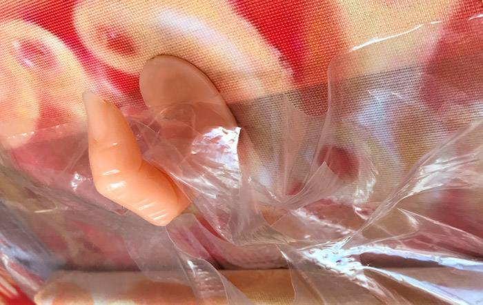 detail: printed fabric, fake finger, plastic bag