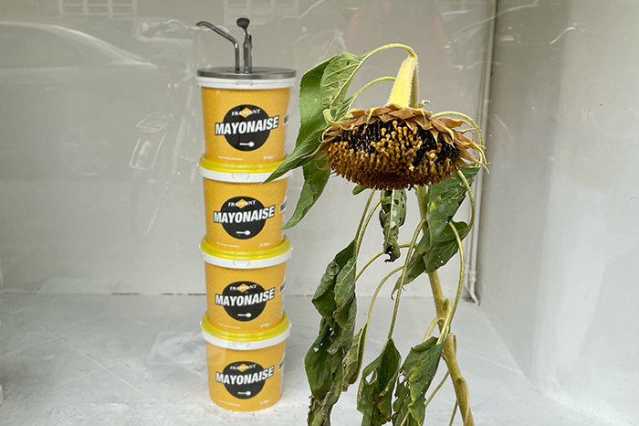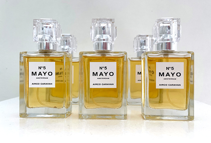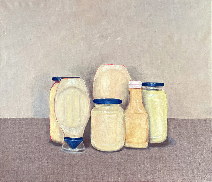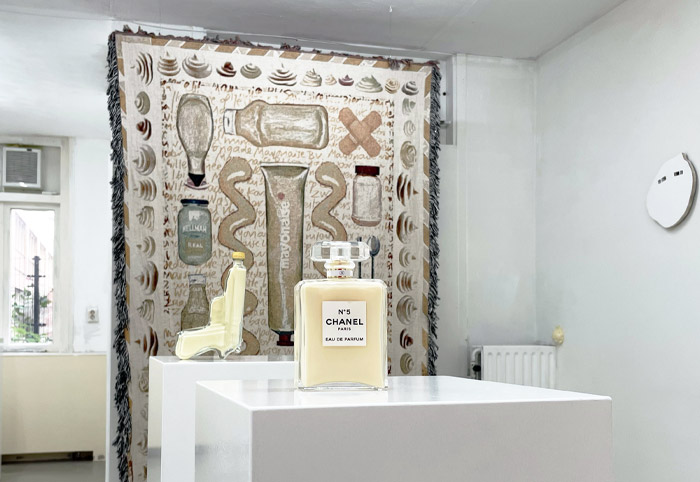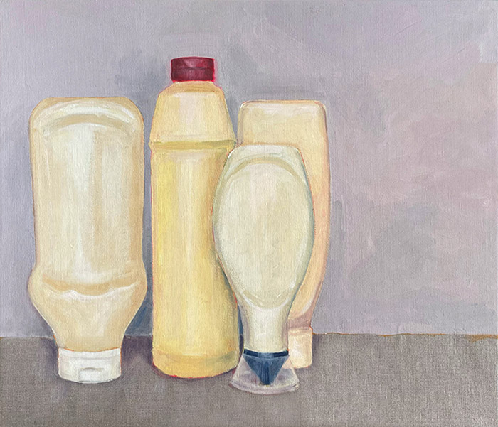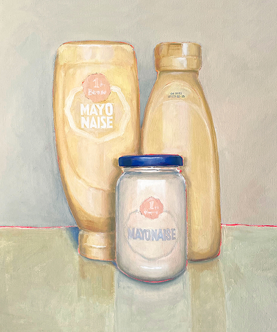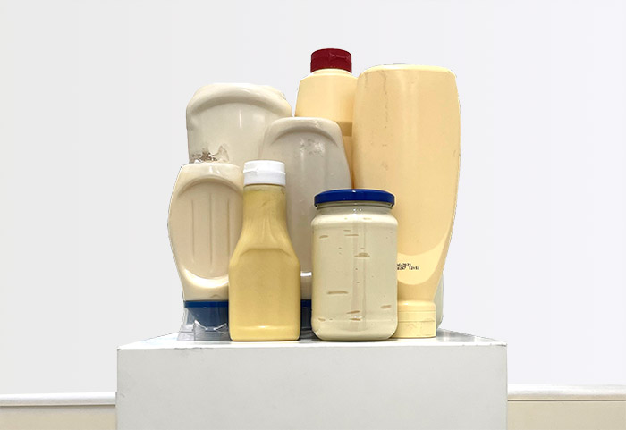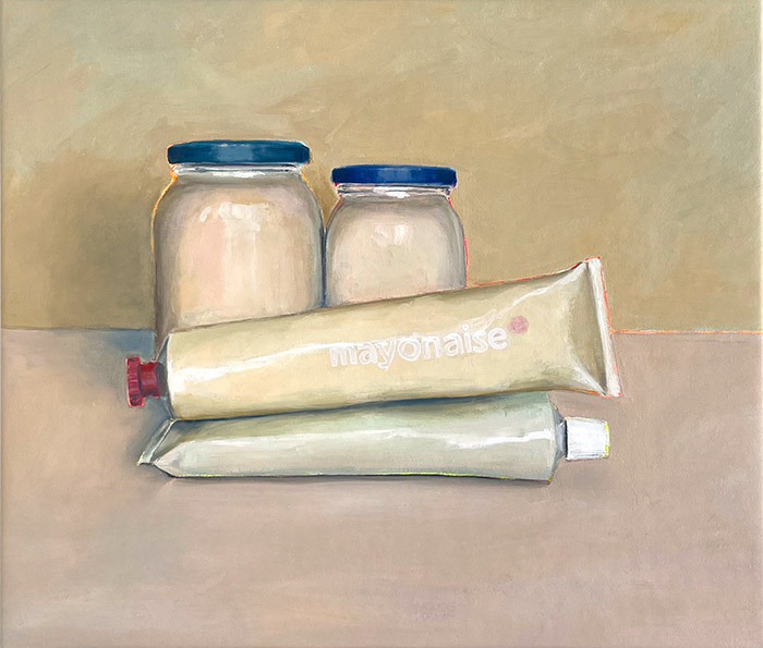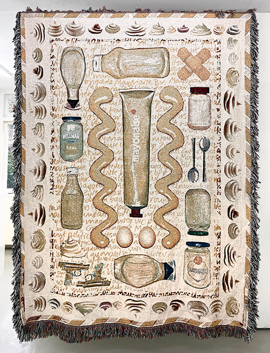 War rugs, installation and series of still lifes with jars, tubes and bottles of mayonnaise. A series inspired by wordsmith Daryll Landbrug, a Black activist who uses other words than 'racist' when protesting against the white racist elite (because he got blocked by Facebook using the word), so he invented creative metaphors like 'white washing powder elite', 'snowmen brigade' and 'The Mayonnaise BV' (Mayonnaise ltd.). This inspired to investigate mayonnaise as a substance and question our white privileged society that is so often not aware of its institutional racism and discrimination. Also the still lifes by Giorgio Morandi were an inspiration.