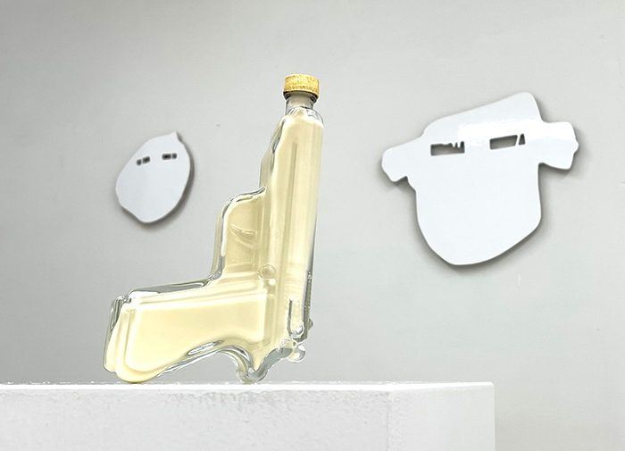Glass gun shaped bottle, 22kt gold leaf, mayonnaise, 4.5 x 8 x 1.5 inches (12 x 21 x 4 cm), 2021