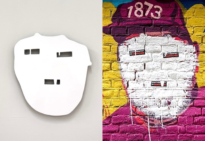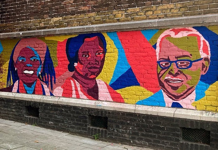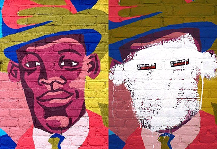 On December 3, 2020, the beautiful wall paintings of Surinamese heroes by Hedy Tjin and Dewi Elsinga on the building of The Black Archives and VOS were defaced by two white men. It was a shocking, racist attack. Anton de Kom, Perez Jong Loy, Sophie Redmond and Hugo Kooks were painted over with white paint. Stickers were put on their eyes and mouth saying ‘sooth pete is genocide’. It was horrible, painful and threatening. Racism may never be called ‘just a joke’, or ‘some stupid guys’. Racism must end.