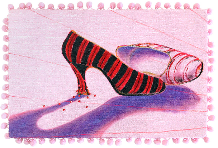 Acrylic and blood diamonds on Chanel fabric, ribbon, mounted on plywood, 18 x 12" (46 x 30 cm)