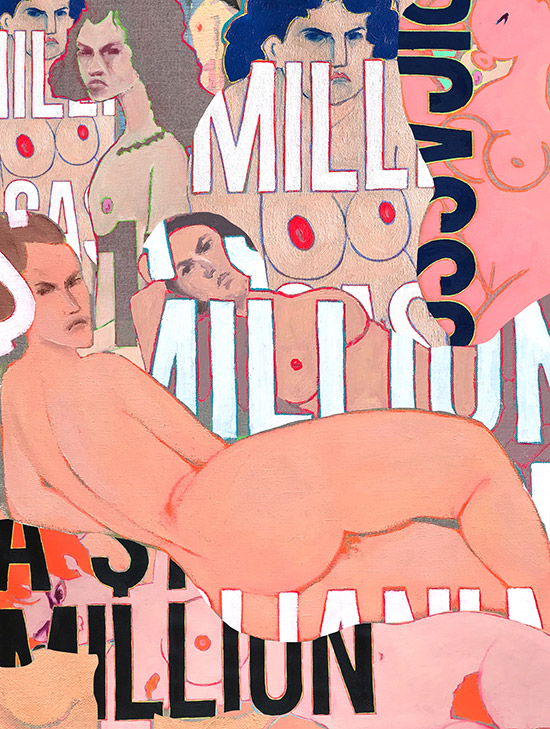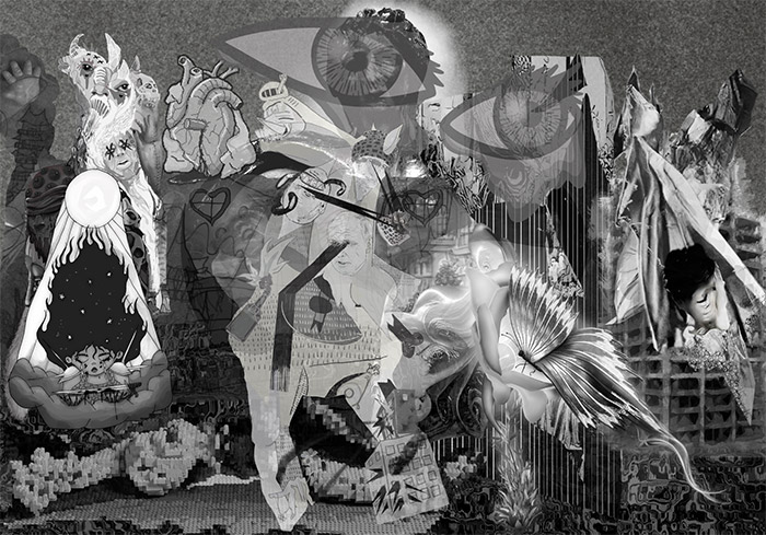 An initial composition of color was created by Shinji Akhirah which helped to inform the delegation of sections via a randomizer. Each artist was randomly assigned an area on the canvas. So I got the pig (Year of the Pig: 2031), and created 3 different Pink piggy's.