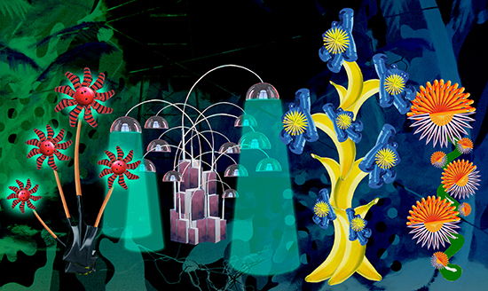 I also created some exotic plants to fill the scene, using everyday objects. Some will recognize unusual murder weapons, that I painted some years ago.