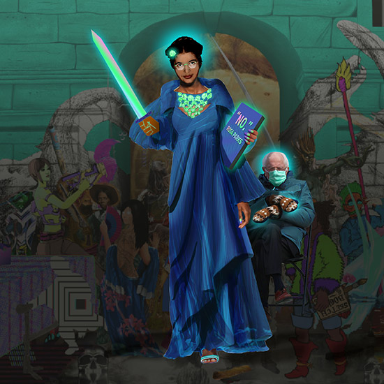 Bernie Sanders went viral when I worked on this in January 2021, he's not visible in the master artwork, but he is there.