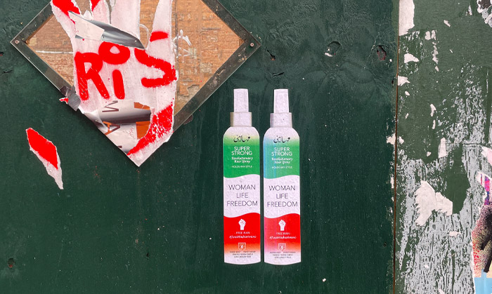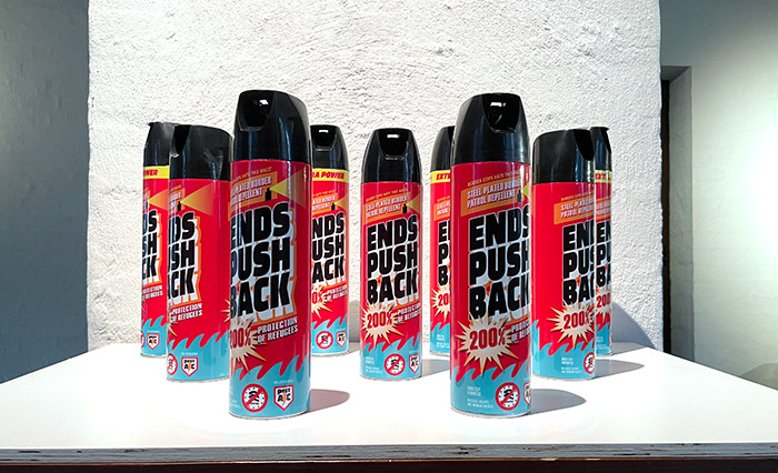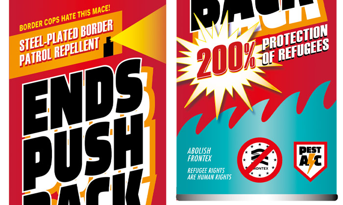 These spray cans are selected for the online exhibition EXODUS.nu in the Netherlands, until September 24, 2023. A repellent spray by Airco Caravan’s Pest Control: “ENDS PUSH BACK. Steel-Plated Border Patrol Repellent; 200% Protection of Refugees. Border cops hate this mace! Abolish Frontex!”